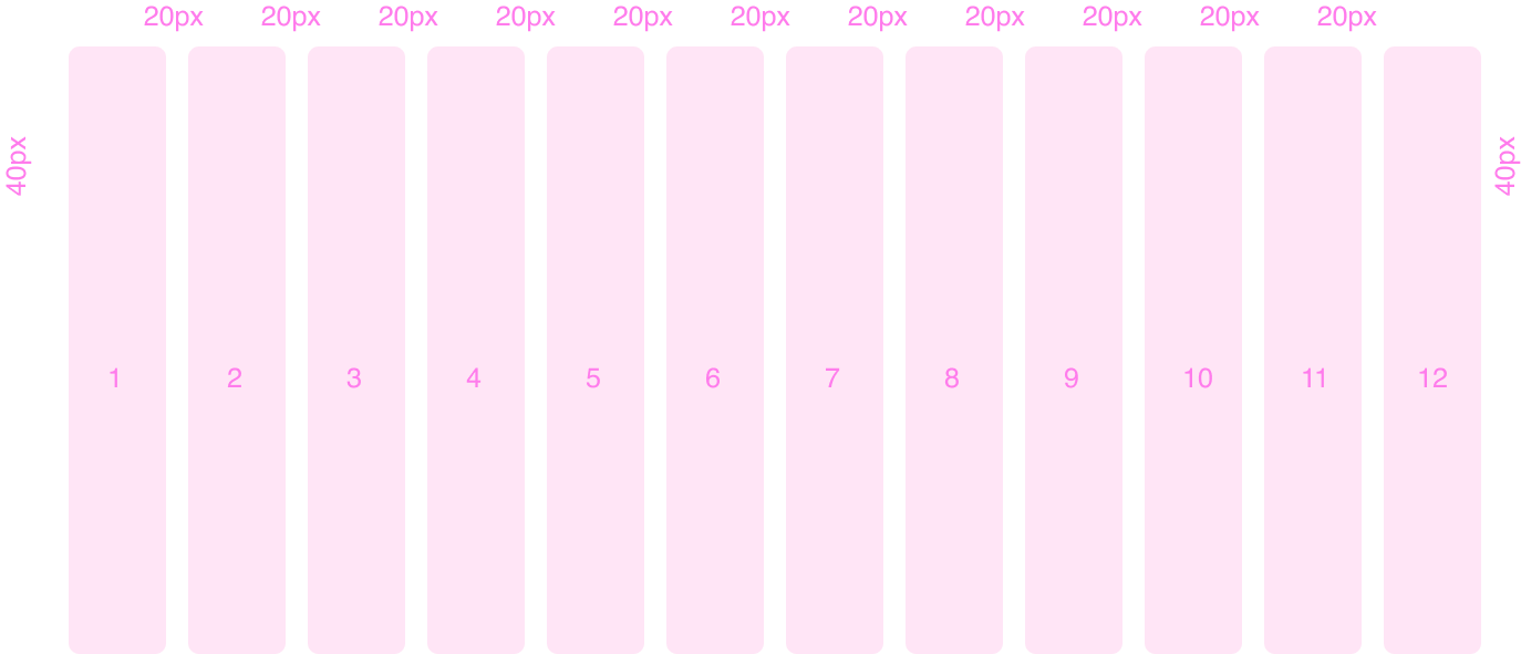 - Desktop: 12 колонок с отступами по 20px между ними и полями по 40px по краям.