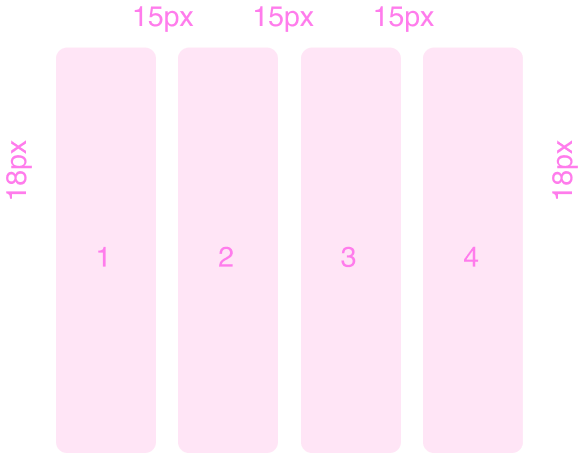 - Mobile: 4 колонки с отступами по 15px между ними и полями по 18px по краям.